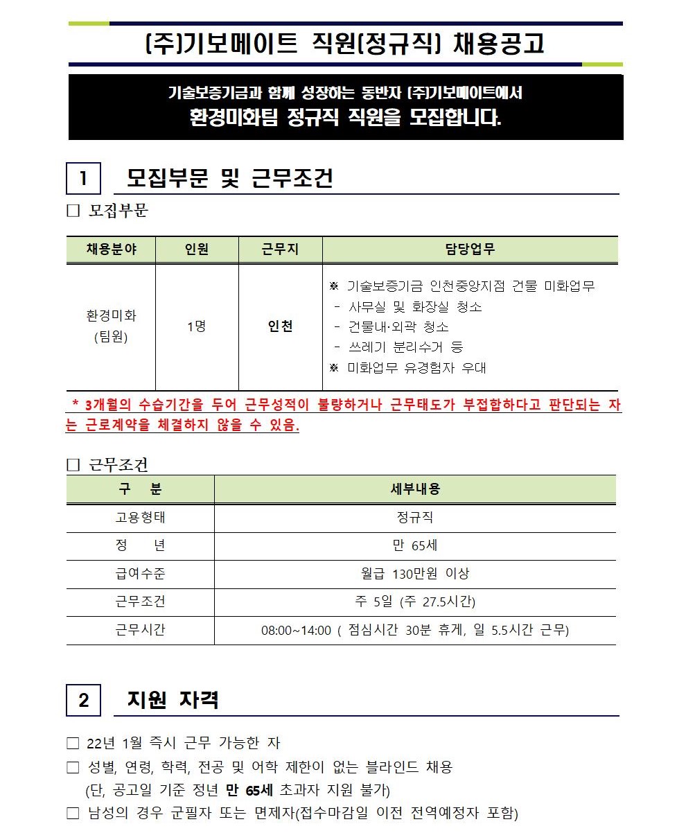 (주)기보메이트 환경미화팀[정규직] 채용공고 - 인천