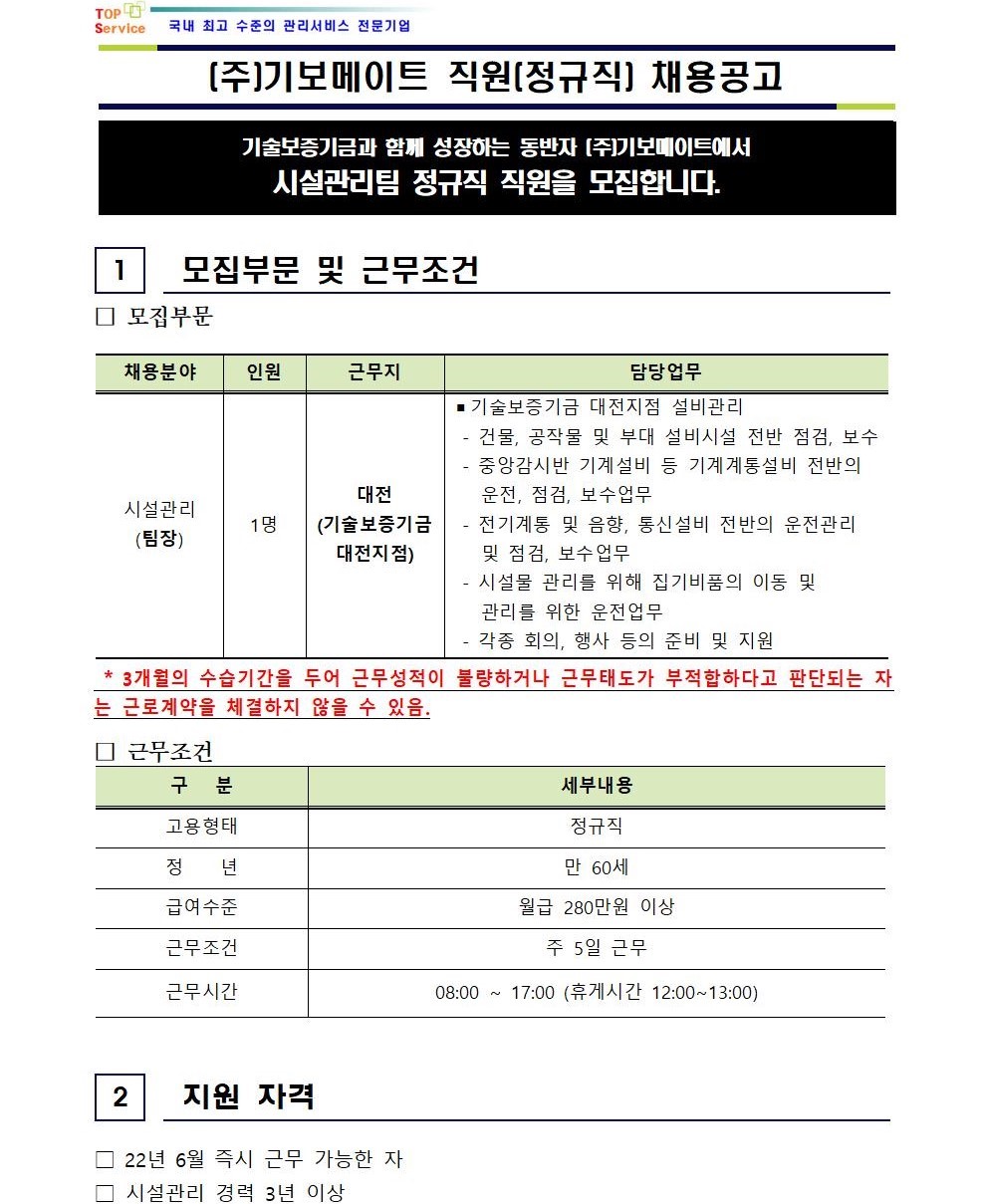 (주)기보메이트 시설관리팀 [정규직] 채용공고 - 대전