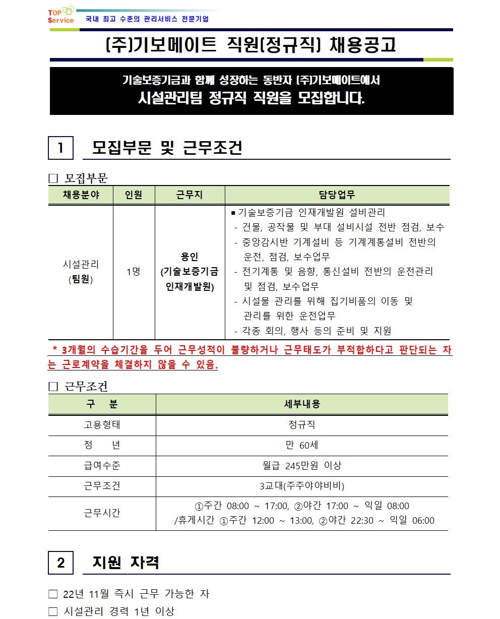 (주)기보메이트 시설관리팀 [정규직] 채용공고 - 용인