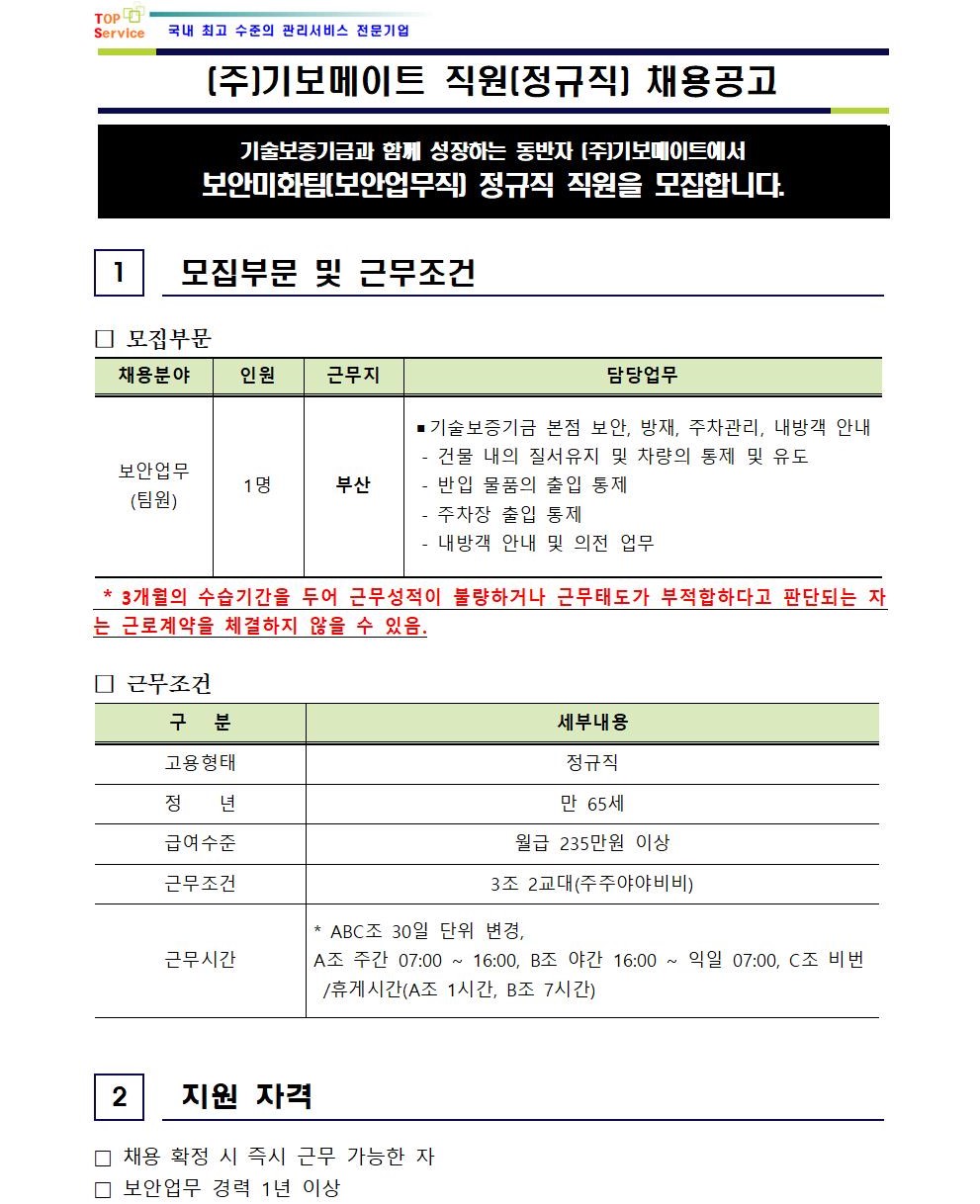 (주)기보메이트 보안미화팀 보안업무직 [정규직] 채용공고 - 부산