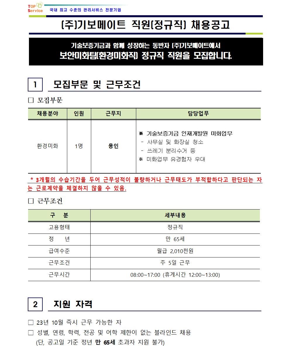 (주)기보메이트 보안미화팀 환경미화직 [정규직] 채용공고 - 용인