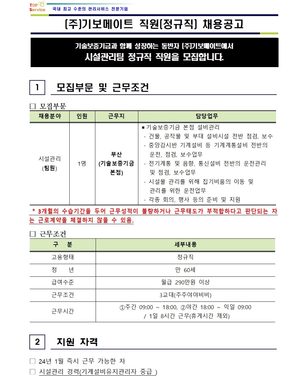 (주)기보메이트 시설관리팀 [정규직] 채용공고 - 부산