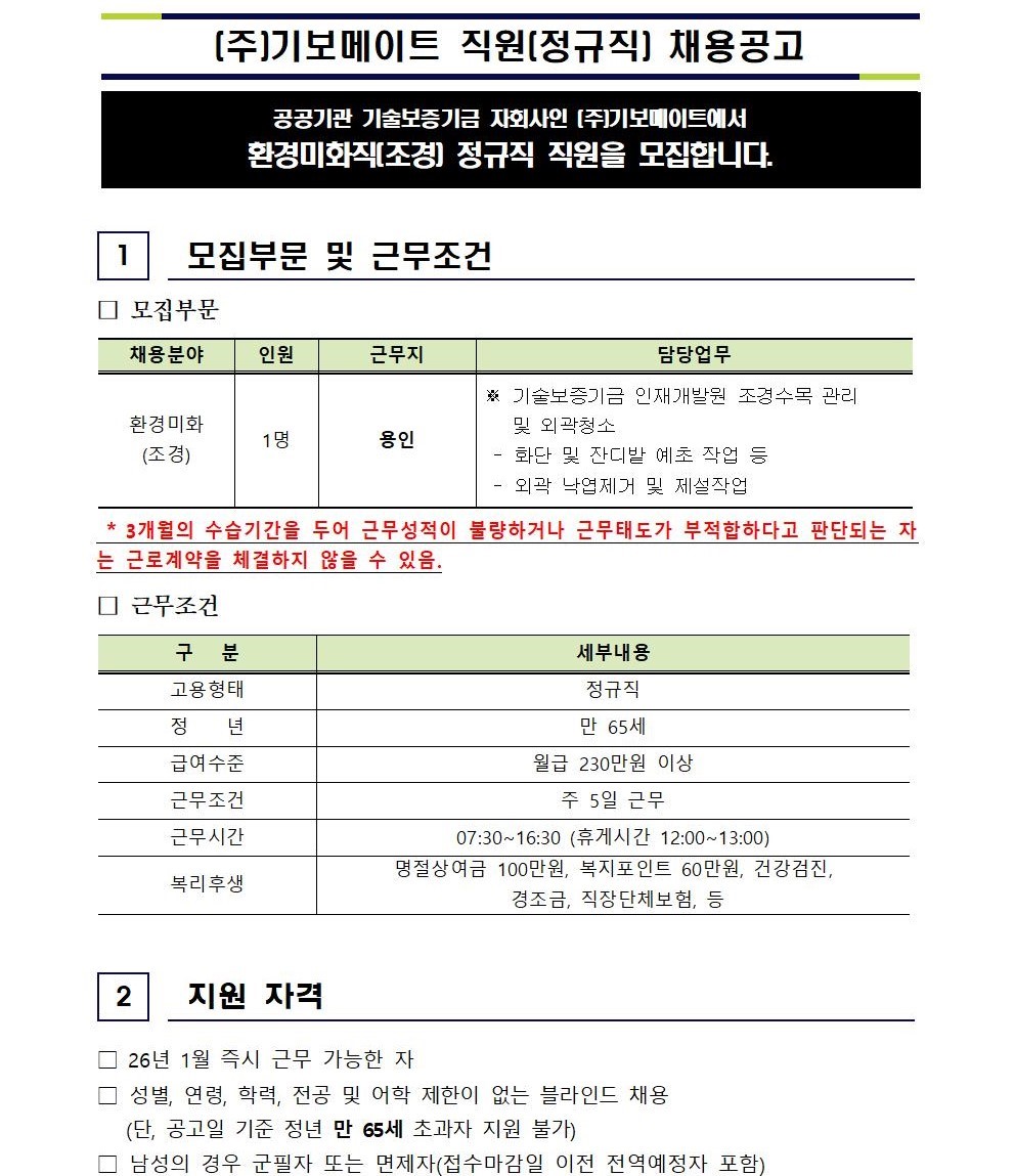 (주)기보메이트 보안미화팀 환경미화직 [정규직] 채용 공고 - 용인
