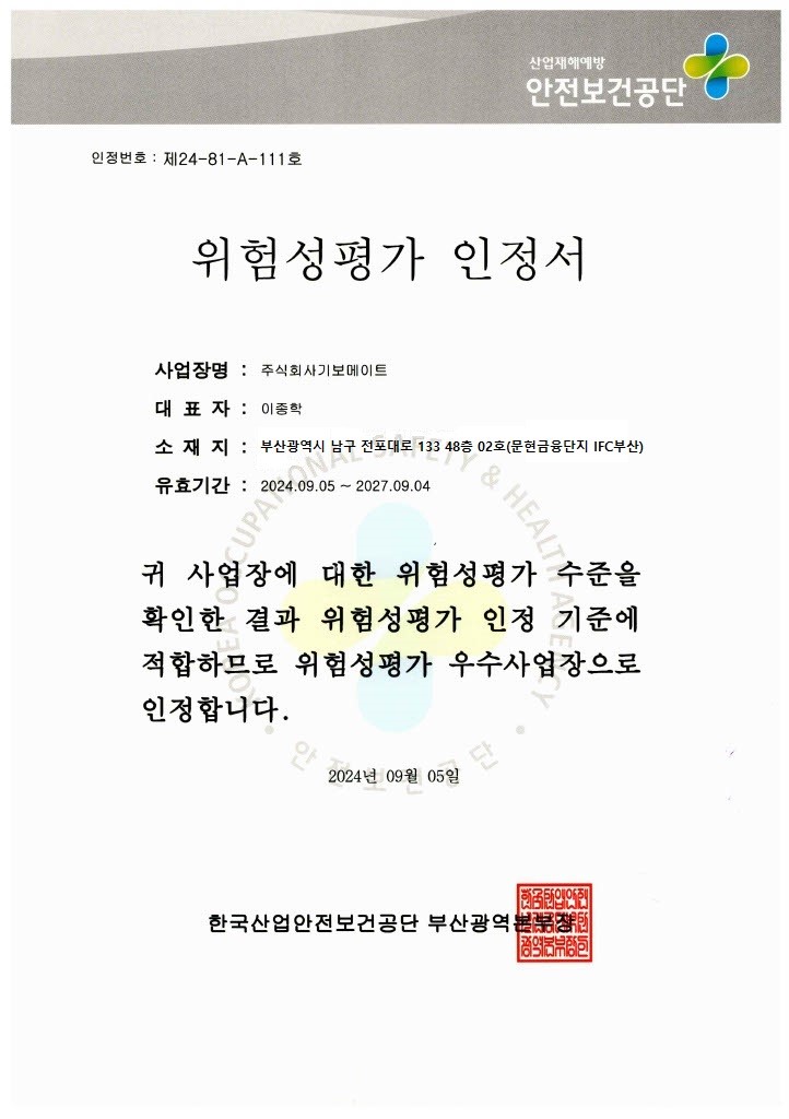안전관리(위험성평가) 우수사업장 인증(2024.09.05)